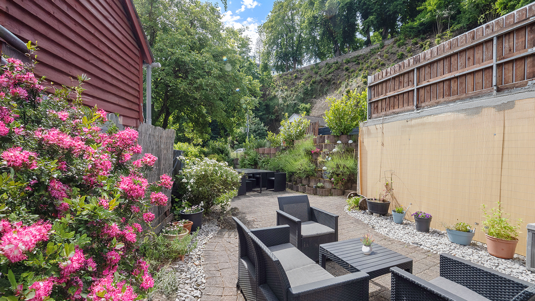 Großzügiger Gemeinschaftsgarten mit Lounge-Möbeln und Grill. Freier Blick auf Wald und Schloss – ideal für den Sundowner. Ruhig, naturnah und dennoch bestens angebunden für Urlaub, Aktivzeit oder Business.